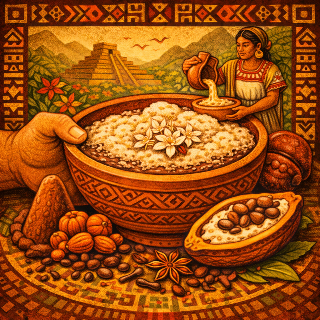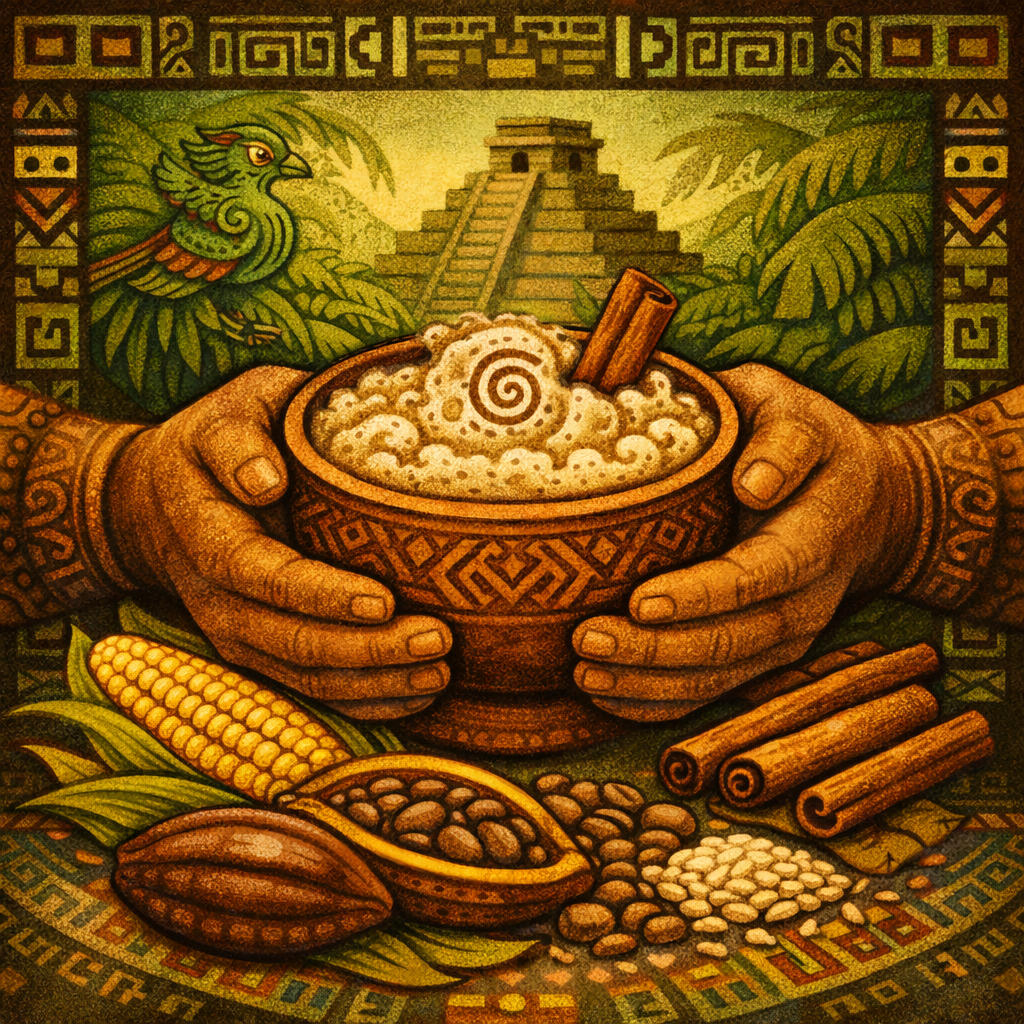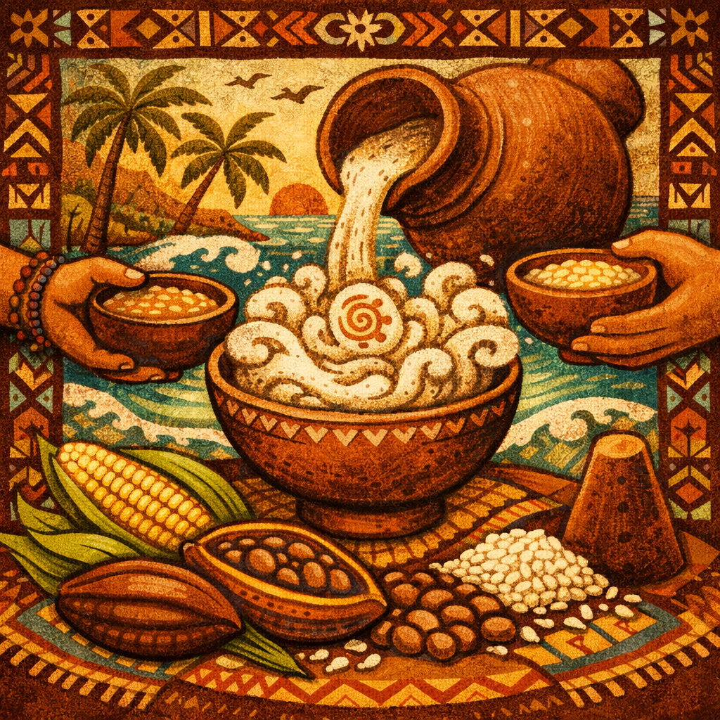 El pozol nace de la cosmovisión maya como sustento físico y espiritual. En Tabasco, esta bebida acompañó durante siglos las jornadas de trabajo y los desplazamientos rituales. Su carácter austero y profundo refleja la relación sagrada entre el cacao y el maíz, considerados elementos fundacionales de la vida.